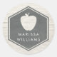 Ein Aufkleber mit einer Abbildung eines Hexagons mit Apfelform. Personalisieren Sie den Namen. Der Hintergrund ist weiß. Suchen Sie im Pink Schoolhouse nach passenden Artikeln.