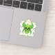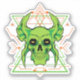 Ein lebendiger grüner Schädel nimmt die Bühne in der Mitte ein, seine leuchtend gelben Augen durchdringen die Dunkelheit. Der Schädel ist mit zwei langen, gekrümmten Hörnern geschmückt, die von den Seiten des Kopfes hervorstehen und dadurch das bedrohliche Aussehen des Kopfes verstärken. Der Schädel wird durch ein komplexes Netzwerk geometrischer Formen gerahmt, darunter Dreiecke, Quadrate und Linien in Orange- und Grüntönen. Diese Muster erzeugen ein Gefühl von Mysterium und Intrige, was auf eine Verbindung zum Übernatürlichen oder Okkulten hindeutet.