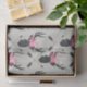 Gewebpapier mit einem schwarzen Hirschkopf mit großen Geweih und mit geometrischen Linien und mit einem rosa Blumenkronen. Pfeile überquert unten. Rustikales und trendiges Design. Der Hintergrund ist ein digitales Bild von weichen beigen Holzplanken.
