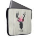 Ein personalisierter Laptop-Ärmel mit einem schwarzen Hirschkopf aus geometrischen Linien und einem rosa Blumenkronen. Rustikales und trendiges Design. Der Hintergrund ist ein digitales Bild von sanft beigefarbenen Holzplanken.