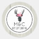 Hochzeitsaufkleber mit den Paarinitialen und dem Hochzeitsdatum. Entworfen mit einem schwarzen Hirschkopf aus geometrischen Linien und mit einem rosa Blumenkronen. Rustikales und trendiges Design. Der Hintergrund ist ein digitales Bild einer Holzstruktur. Personalisieren Sie Ihre Initialen.