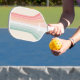 Dieses Set von Paddeln aus Pickleball bietet einen geometrisch gestreiften Retro-Hintergrund in sanften Pastellfarben und Ihren Wunschnamen (oder löschen Sie den Beispielnamen und verließ Leerzeichen).