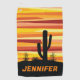 Abstrakte geometrische Sonnenuntergangsbild der Wüste mit gelben, orangen und roten diagonalen Streifen und Kaktusdekoration. Fügen Sie Ihren Namen/Monogramm hinzu oder löschen Sie den Text.