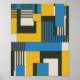 Ein auffallendes geometrisches abstraktes Design mit überlappenden Rechtecken und Quadraten in fett gelb, lebendig blau, tiefschwarz und weich cremefarben. Das Layout verbindet solide Farbblöcke mit gestreiften Schnitten und schafft so Rhythmus und Bewegung über die Komposition hinweg. Starke Kontraste und saubere Linien verleihen dem Kunstwerk einen modernen, dynamischen Look, der es perfekt für zeitgenössische Dekoration, Drucke oder stilvolle Hintergründe macht.