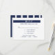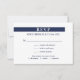 Moderne Hochzeitsrotti RSVP mit minimalistisch marineblau Text auf weißem Hintergrund auf der Vorderseite mit anpassbaren Menüoptionen. Ganz oben befindet sich eine waagerechte Marinebrücke, die den größten Teil mit den weißen Buchstaben in Weiß überquert. Personalisieren Sie den Text in der Sidebar. Die Rückseite ist dunkelblau mit weißen Streifen, die sich nicht bis zur Kreuzung erstrecken. Die Linien bilden ein geometrisches Grundmuster. © Claire E. Skinner, Alle Rechte vorbehalten.