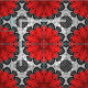 Stoff in geometrisch geformtem Farbmuster in tiefrot / rot auf schwarz-weiß gemustertem Hintergrund