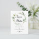 Diese geometrisch elegante goldfarbene Grünanlage Save the Date Postkarte eignet sich perfekt für eine einfache Hochzeit. Das Design besteht aus handbemalten botanisch-grünen Eukalyptus-Blätter, die einen goldenen geometrischen Rahmen schmücken.