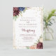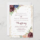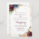 Diese geometrische goldene Glitzer-Vorder- und Rückseite lädt zu einer rustikalen Hochzeit ein. Das Design ist mit handgezeichnet Aquarell-lila, Marineblau, Rot, Bordeaux, Marineblau-Blume, grünen und goldenen Blätter, die einen eleganten geometrischen Rahmen schmücken. Rett Papier, indem man mehr Details auf der Rückseite der Einladung anstatt auf einer separaten Gehäusekarte angibt.