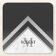 Dieser Untersetzer ist geometrisch gestaltet und mit einem individuell anpassbaren Namen und Monogramm in weißem Marmor und silberfarbenem Rahmen auf schwarzem Hintergrund gestaltet.