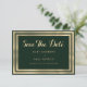Geometrisches modernes Waldgrün und goldfarbene, elegante Hochzeitseinladung Save the Date. Diese luxuriöse, einfache, dunkelgrüne und goldene Einladung ist perfekt für jede klassische und raffinierte Veranstaltung oder Anlass. Dieses exquisite und beeindruckende Design ist perfekt für das trendige und stilvolle Individuum oder Paar. Passen Sie dieses Design mit Ihren eigenen Nachrichten und personalisierten Informationen an. Alle Designs sind gedruckt.