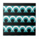 Geometrische Musterdarstellung mit Streifen, Kreisen und runden Formen in den Farben Türkis, Schwarz und Weiß