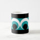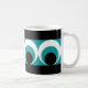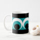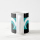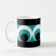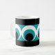 Geometrische Musterdarstellung mit Streifen, Kreisen und runden Formen in den Farben Türkis, Schwarz und Weiß