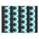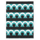 Geometrische Musterdarstellung mit Streifen, Kreisen und runden Formen in den Farben Türkis, Schwarz und Weiß