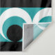 Geometrische Musterdarstellung mit Streifen, Kreisen und runden Formen in den Farben Türkis, Schwarz und Weiß