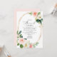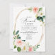Brunch und Bubby Dusche Einladung mit eleganten handbemalten Aquarellblüten, rosa und weißen Blumen mit Grün, ovalen geometrischen Rahmen und goldenen Punkten.