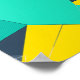 Ein abstraktes geometrisches Design mit einem kühnen zentralen Cyan oder einem aquamarinen Hexagon, gerahmt durch ein komplexes Mosaik aus bunten Dreiecken und Polygonen. Die umliegenden Formen sind mit einer Palette von gelben, dunkelmarineblauen Blautönen und verschiedenen aquamarinen Farbtönen gestaltet. Einige der dunkleren und aquamarinen Abschnitte enthalten subtile lineare Muster und dünne, weiße Vektorlinien, die dem sonst flachen, sauberen Design Textur und Tiefe verleihen. Dieses Stück erinnert an eine moderne, scharfe und dynamische Energie.