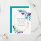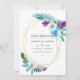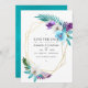 Türkisfarbene und lila tropische Blätter Hochzeit speichern das Datum mit goldenem geometrischem Rahmen und elegante Typografie.