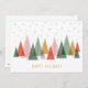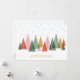 Ein minimalistisches Design, das einen farbenfrohen Wald mit stilisierten, geometrischen Bäumen unter fallenden Schneeflocken zeigt. Die hellen Farben und die modernen Formen schaffen eine fröhliche und festliche Urlaubsatmosphäre.