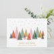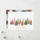 Ein minimalistisches Design, das einen farbenfrohen Wald mit stilisierten, geometrischen Bäumen unter fallenden Schneeflocken zeigt. Die hellen Farben und die modernen Formen schaffen eine fröhliche und festliche Urlaubsatmosphäre.