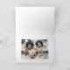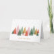 Ein minimalistisches Design, das einen farbenfrohen Wald mit stilisierten, geometrischen Bäumen unter fallenden Schneeflocken zeigt. Die hellen Farben und die modernen Formen schaffen eine fröhliche und festliche Urlaubsatmosphäre.