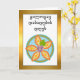 Geburtstagsgrüße in georgianischer Sprache geschrieben. Herzlichen Glückwunsch zum Geburtstag auf dem Cover mit einer Illustration von Chachapuri adjaruli, Käsebootbrot mit einem Eigelb und Butterflecken auf der Oberseite. Fünf Laiben werden auf einem blauen Platter platziert, um einer Blume zu ähneln. Auf der Platte gibt es in der Mitte einen Haufen Trauben. Vielleicht nur der Anfang einer festlichen Supra, um einen besonderen Tag zu feiern. Art, Bild und Vers Copyright © Shoaff Ballanger Studios, 2023.