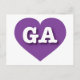 Auf dieser Postkarte befindet sich ein pulsierendes lila Herz mit den fett-, weiß-, Großbuchstaben GA, der offiziellen Abkürzung für Georgia, dem PfirsichStaat. Die Rückseite der Postkarte ist leer und wartet auf Ihren personalisierten Text oder Ihre handgeschriebenen Gefühle.