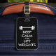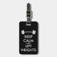Behalt Ruhe und hebe Gewichte Reisegepäck Tag. Fantastisches Reiselabel für Taschen und Koffer. Individuell anpassbares Vintages Slogan Design für Reisende. Schwarz oder eine beliebige Farbe. Erstellen Sie Ihre eigene lustige Behalt Ruhe und führen Sie Parodie weiter. Hintergrundfarbe und Text können geändert werden. Coole Geschenkgutscheine für Wattlifter, Bodybuilder oder Fitness Instruktor. Barbell-Design mit Workout, Gewichtung, Bodybuilding-Slogan.