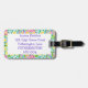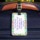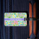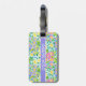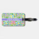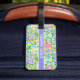 Ein hübscher doppelseitiger, Acrylgepäckanhänger mit einem Muster aus tiefrosa, tiefblau und gelb blauen Grunzen, von einem handbemalten Aquarelldesign von Judy Adamson. Der Gurt ist aus Leder.