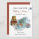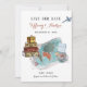 Gepäckkarte Hochzeit in Urlaubsort Save the Date mit Vintager Karte und Koffern, Reisepass und Flugzeug für Ihre Hochzeit in Urlaubsort.