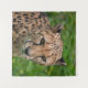 Ein nah-up Bild eines Geparden, der direkt auf die Kamera starrt. Das Gesicht des Geparden füllt den Rahmen und hebt seinen intensiven Blick und seine charakteristischen Gesichtszüge hervor. Der Hintergrund ist in Grün gehalten und bildet einen lebendigen Kontrast zum gepunkteten Fell der Geparden.