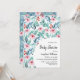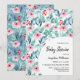 Die Babyduscheinkarte mit dezenten Aquarellbildern und sanften pastellfarbenen smaragdgrünen und blauen Blätter, Zweigen und sanften rosa Blume.