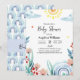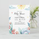Die Babyduscheinkarte ist mit hübschen Aquarellbildern in Pastellfarben mit smaragdgrünen und blauen Blätter, Ästen, Regenbögen und sanften rosa Blume gestaltet.