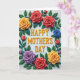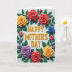 Diese Grußkarte zeigt einen hellweißen Hintergrund mit großen, erhabenen Ringelblumen-gelben Buchstaben, die wie eine fröhliche Überschrift zentriert sind. Die Schrift sieht weich texturiert und leicht unscharf aus, mit sanften Schatten, die sie fühlbar machen, und die Nachricht ist der Hauptfokus. Ein Ring aus detaillierten Rosen und Knospen umgibt den Text, und die enge Anordnung von Blütenblättern und Blättern gibt der Anordnung ein intimes, zusammengestelltes Gefühl ❤️. Die Blumen mischen tiefe rote, sonnengelbe, reiche blaue und helle lavendelfarbene Blüten und suggerieren eine süße Nähe wie Freunde, die sich für ein Foto zusammenlehnen. Smaragdgrüne Blätter mit sichtbaren Adern winden sich zwischen den Blüten und bilden einen kranzartigen Rand, der die Augen zurück in die Mitte führt. Der Text sitzt in der Mitte in warmem Gelb, während der Blumenrand an den Rändern bleibt und einen ruhigen weißen Rand lässt, der alles leicht lesbar hält 🌼. Weiches, diffuses Licht
