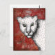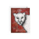 Gepunktet Leopard Says Hey mit einem weißen Leoparden mit taupen Flecken und grünen Augen über einem strukturierten roten Hintergrund.