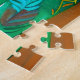 Puzzle in einer stilisierten Abbildung einer niedlichen, gepunkteten Stadt in einem märchenhaften Waldgebiet, umgeben von Bäumen und Pflanze, in Brauntönen und Grüntönen