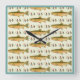 Kleine Wanduhr mit Thema Forellenfischerei. Gepunktete Forelle- und Fischfliegen-Hintergründe sind perfekt für das Zuhause-Büro oder die menschliche Höhle eines Fischers.