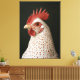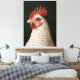 Ein hochrealistisches Portrait eines gepunkteten Hühners mit roten und weißen Federn, detailliertem Kamm und Wattläden, Set vor dunklem Hintergrund.