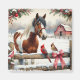 Der bebaute Weihnachtsmagnet mit einem hübschen braunen und weißen gepunkteten Pferd mit einem männlichen und weiblichen Kardinal auf dem Zaun mit einer rustikalen Scheune im Hintergrund einer schneebedeckten Aquarellkunst.