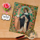 Die heilige Rose Limas (1586-1617) wollte, Nonne zu werden, aber ihr Vater weigerte sich, es zu erlauben. Schließlich durfte sie jedoch dem Dritten Orden der Heiligen Dominik beitreten, um ihre Apostolat auf der Zuhause zu leben. + In diesem stilisierten Portrait steht die St. Rose neben einem Prie-dieu oder Kneeler. Ein offenes Buch lag auf seinem Regal. Die St. Rose ist in einer dominikanischen Gewohnheit verkleidet, die aus einem weißen Schnabel, einem cremefarbenen Gewand und Skulpturen, einem schwarzen Gürtel und Rosenkranz sowie einem schwarzen Schleier und Mantel besteht. Auf ihrem Kopf trägt sie eine Dornenkrone wie die St. Catherine von Siena, ihr Vorbild, anstatt ihres gewohnten Attributs: eine Krone von Rose. (Rose werden jedoch in den aufwändigen ovalen Rahmen des Bildes eingebunden, der hier teilweise sichtbar ist). In ihrer rechten Hand hält sie ein Lilienspray, das ihren Status als geweihte Jungfrau angibt. Jenseits der niedrigen Mauer, die den Vordergrund vom Hintergrund trennt, liegt eine tropische peruanische Landschaft. + St. Rose Lima ist die erste katholische in Amerika, die zum Heiligen erklärt wird. Sie ist die Schutzpatronin von Gärtnern und Floristen sowie Peru, Nord- und Südamerika und den Philippinen. + Fest: August 23 + Image Credit (K 48): Detail eines antiken Bildes der Rose Lima von Henry Riancey's La vie des Saints : illustrée en chromolithographie, d'aprè s les manuscrits de tous les sicles, publiée par F. Kellerhoven (Paris: Librairie Bachelin) Deflorenne, [1874]), S. 288, aus der privaten Bibliothek des Designers. Franz Kellerhoven (1814-1872), der Chromolithograph, war ein deutscher Priesterkünstler, der nach Paris wanderte und dort einen Printshop gründete. Er spezialisierte sich auf Kunstwerke aus mittelalterlichen Handschriften, aber auch Lithos von Gemälden und antiken Architekturwerken.