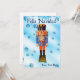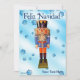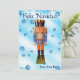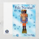 Ein traditioneller deutscher Holzfußkrecker, der einen Offizier mit einer blauen und orangefarbenen Uniform darstellt. Der Nutcracker wird auf einem blauen Hintergrund mit Schneeflocken überlagert. Auch der spanische Text "Feliz Navidad" (Frohe Weihnachten) erscheint. Fügen Sie Ihren eigenen zusätzlichen Text hinzu.