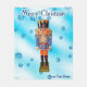 Ein traditioneller deutscher Holzfußkrecker, der einen Offizier mit einer blauen und orangefarbenen Uniform darstellt. Der Nutcracker wird auf einem blauen Hintergrund mit Schneeflocken überlagert. Es erscheint auch Text mit dem Text "Frohe Weihnachten". Fügen Sie Ihren eigenen zusätzlichen Text hinzu.