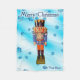 Ein traditioneller deutscher Holzfußkrecker, der einen Offizier mit einer blauen und orangefarbenen Uniform darstellt. Der Nutcracker wird auf einem blauen Hintergrund mit Schneeflocken überlagert. Es erscheint auch Text mit dem Text "Frohe Weihnachten". Fügen Sie Ihren eigenen zusätzlichen Text hinzu.