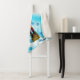 Ein traditioneller deutscher Holzfußkrecker, der einen Offizier mit einer blauen und orangefarbenen Uniform darstellt. Der Nutcracker wird auf einem blauen Hintergrund mit Schneeflocken überlagert. Es erscheint auch Text mit dem Text "Frohe Weihnachten". Fügen Sie Ihren eigenen zusätzlichen Text hinzu.