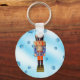 Ein traditioneller deutscher Holzfußkrecker, der einen Offizier mit einer blauen und orangefarbenen Uniform darstellt. Der Nutcracker wird auf einem blauen Hintergrund mit Schneeflocken überlagert.