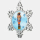 Ein traditioneller deutscher Holzfußkrecker, der einen Offizier mit einer blauen und orangefarbenen Uniform darstellt. Der Nutcracker wird auf einem blauen Hintergrund mit Schneeflocken überlagert.