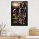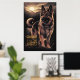 Ein deutscher Schäferhund steht stolz vor einer Bergkulisse bei Sonnenaufgang. Die Sonne geht hinter dem Hund auf und wirft ein warmes Licht auf sein Fell. Der Hund schaut direkt auf den Betrachter, mit einem entschlossenen Ausdruck auf seinem Gesicht. Unter dem Hund steht ein Zitat über Mut.