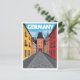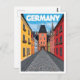 Bring the charm of a historic European town home with this stunning Germany travel poster! This stylized design features a perspective view down a cobblestone street, framed by brightly colored buildings in shades of yellow, red, and orange, leading toward an old gate tower. The background features a tall cathedral spire, evoking the atmosphere of a classic German city like Rothenburg ob der Tauber or Regensburg.