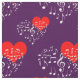 Ein nahtloses Muster herzförmiger Noten mit weißer Farbe über dem roten Herz vor violettem oder lila Hintergrund. Liebe, Musik, romantisches Design "Das singende Herz" für jeden. Sie können das Kippmuster, die Größe und den Rotationswinkel ändern. Seien Sie einfach kreativ, nutzen Sie dieses schöne Gewebe für jedes Ihrer Projekte und seien Sie glücklich!