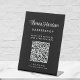 Modernes, schwarzes Tischschild für Ihr Unternehmen, das Ihren Namen in einem stilvollen, weißen Schrift und Geschäftstyp in einfachen, weißen Schriftzeichen zeigt. Geben Sie Ihre Website-Adresse ein, um einen QR-Code zu erstellen, den Kunden und Kunden nach Terminen, Produkten, Dienstleistungen, Stunden usw. durchsuchen können. Sie können die Größe des Skripts anpassen, indem Sie im Entwurfswerkzeug für längere oder kürzere Namen bearbeiten.