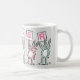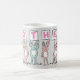 Fun Gift Tasse für Mutter. Spaß Weiße Tasse mit der Illustration von Kaninchen in Rosa und Blau. Die Kaninchen halten Karten hoch, um das Wort Mutter auszudrücken. Niedliche Babykaninchen auf einer Kaffee-Tasse. Geschenk für Mama.